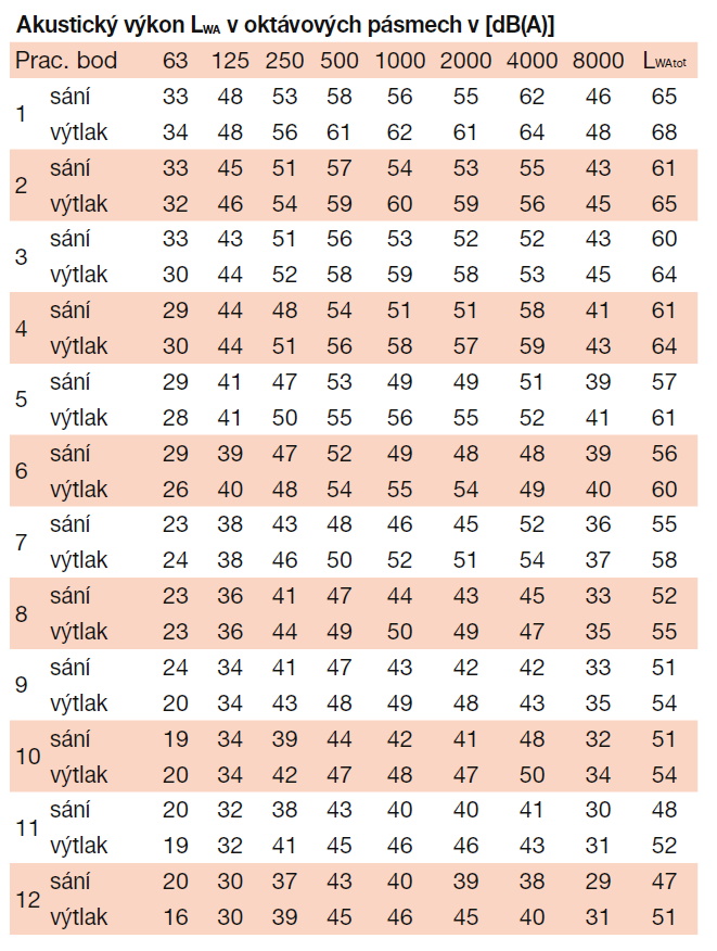 ![]() | Hluk Hluk emitovaný ventilátorem je uveden v tabulkách. Hodnoty LpA na výkonových charakteristikách jsou měřeny ve volném poli na straně sání ve vzdálenosti 1,5 m. | |