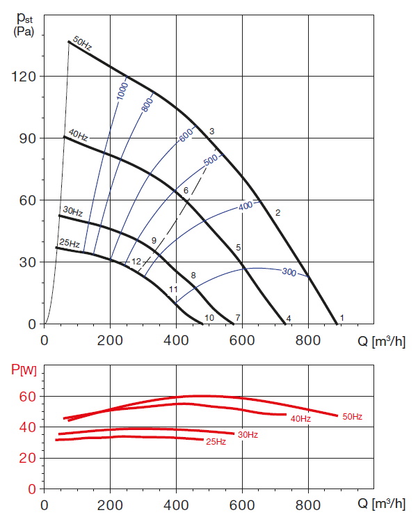 | otáčky [min-1] | příkon [W] | proud [A] | průtok (0 Pa) [m3/h] | napětí [V] | teplota [°C] | akust. tlak - sání [dB(A)] | akust. tlak - výtlak [dB(A)] | hmot. [kg] | velikost přísl. | regulátor |
