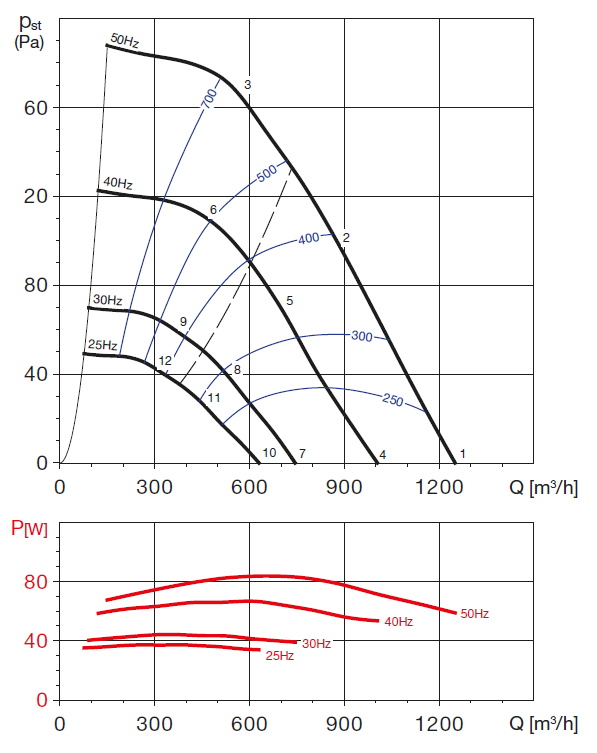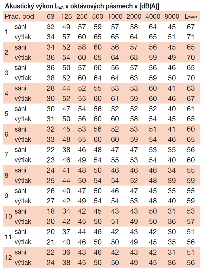 | otáčky [min-1] | příkon [W] | proud [A] | průtok (0 Pa) [m3/h] | napětí [V] | teplota [°C] | akust. tlak - sání [dB(A)] | akust. tlak - výtlak [dB(A)] | hmot. [kg] | velikost přísl. | regulátor |