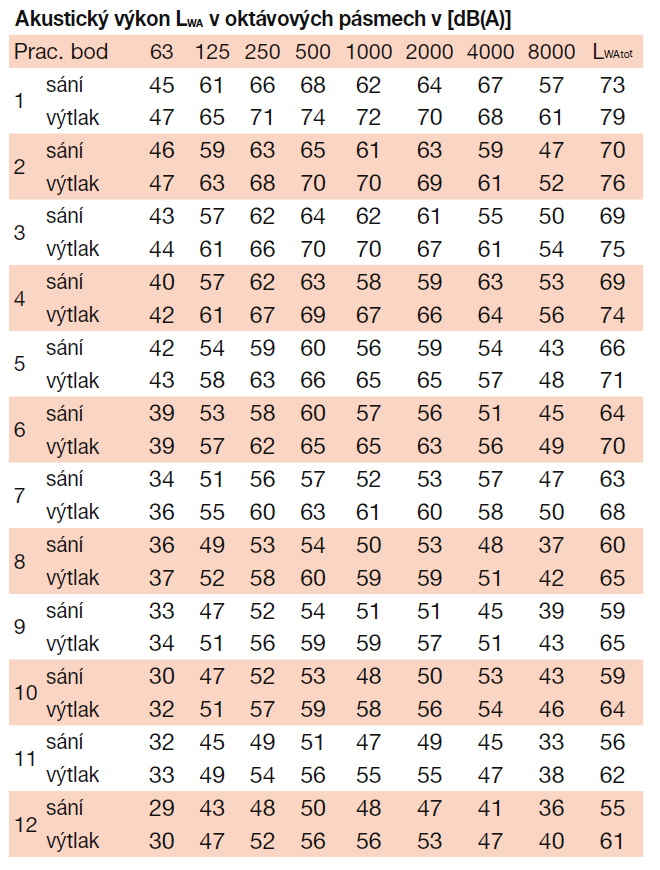 ![]() | Hluk Hluk emitovaný ventilátorem je uveden v tabulkách. Hodnoty LpA na výkonových charakteristikách jsou měřeny ve volném poli na straně sání ve vzdálenosti 1,5 m. | |