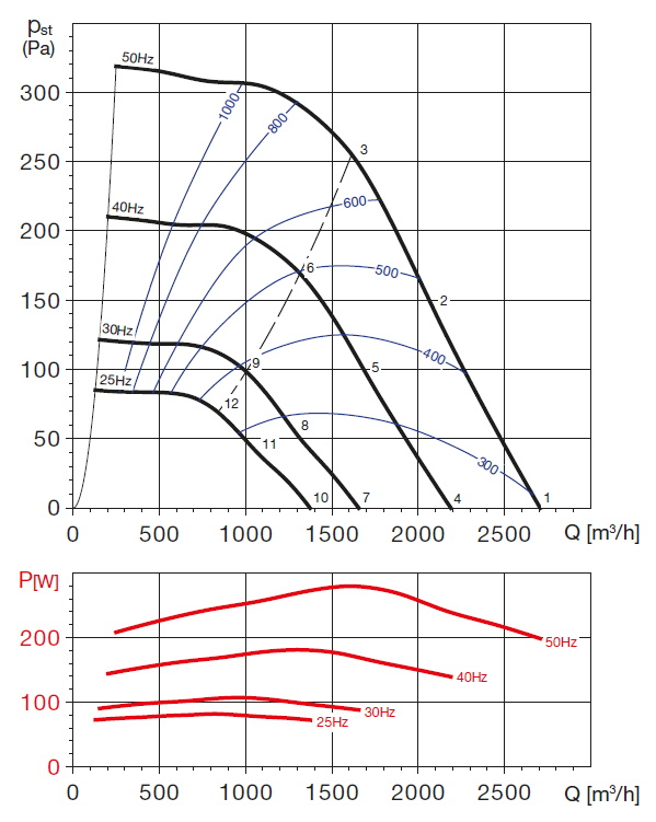 | otáčky [min-1] | příkon [W] | proud [A] | průtok (0 Pa) [m3/h] | napětí [V] | teplota [°C] | akust. tlak - sání [dB(A)] | akust. tlak - výtlak [dB(A)] | hmot. [kg] | velikost přísl. | regulátor |