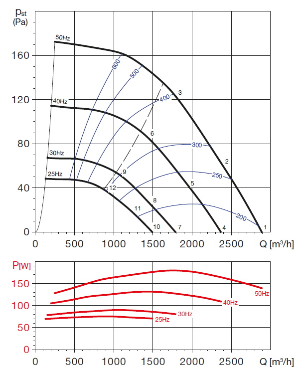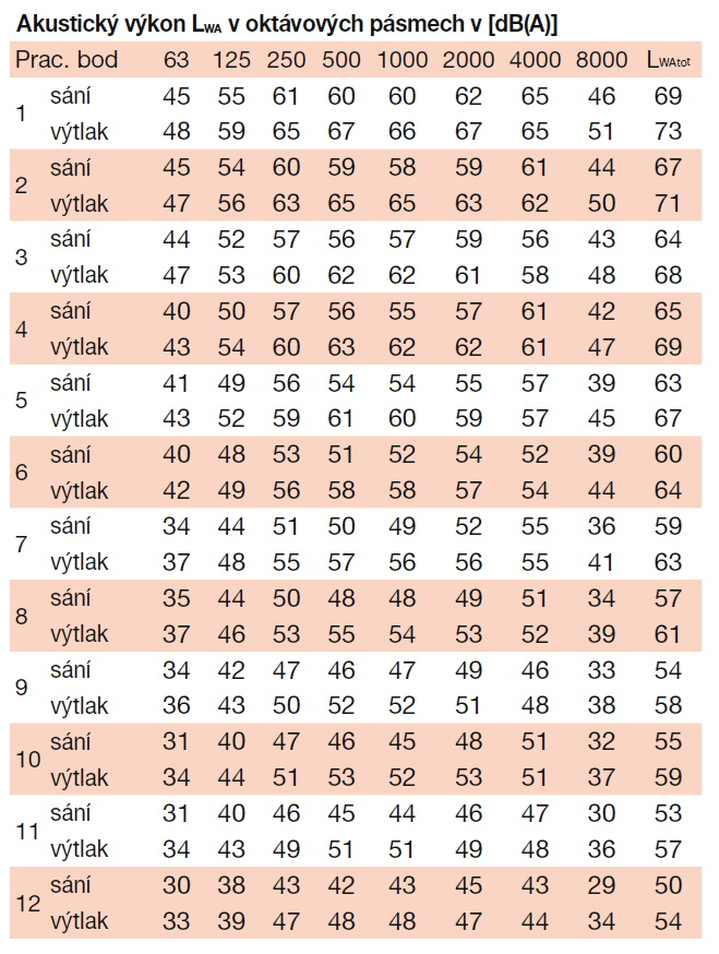 | otáčky [min-1] | příkon [W] | proud [A] | průtok (0 Pa) [m3/h] | napětí [V] | teplota [°C] | akust. tlak - sání [dB(A)] | akust. tlak - výtlak [dB(A)] | hmot. [kg] | velikost přísl. | regulátor |
