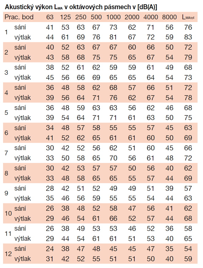 ![]() | Hluk Hluk emitovaný ventilátorem je uveden v tabulkách. Hodnoty LpA na výkonových charakteristikách jsou měřeny ve volném poli na straně sání ve vzdálenosti 1,5 m. | |