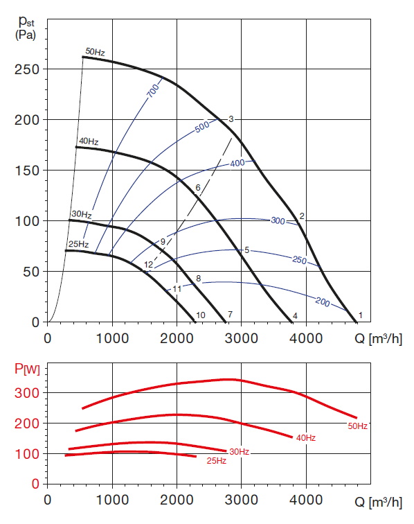 | otáčky [min-1] | příkon [W] | proud [A] | průtok (0 Pa) [m3/h] | napětí [V] | teplota [°C] | akust. tlak - sání [dB(A)] | akust. tlak - výtlak [dB(A)] | hmot. [kg] | velikost přísl. | regulátor |