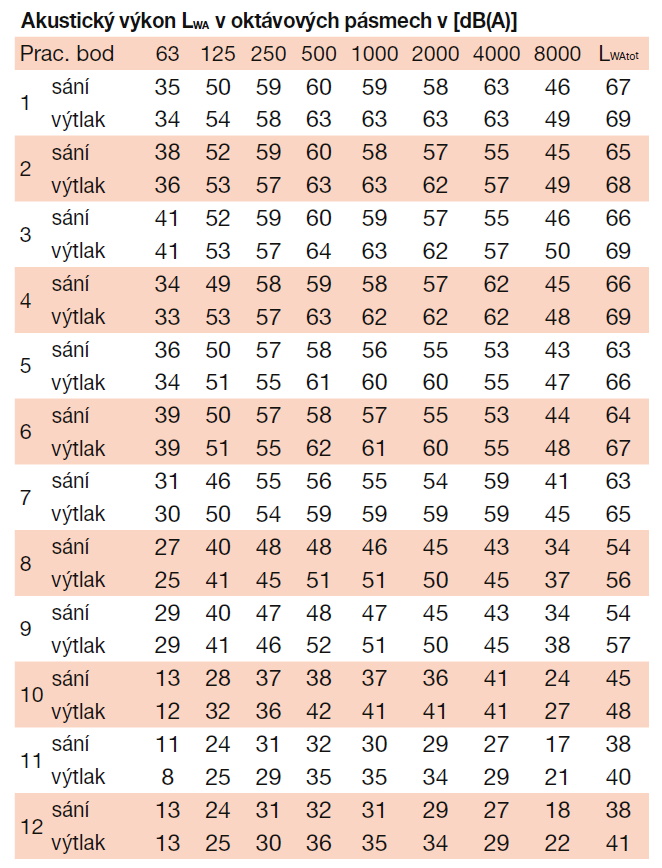 ![]() | Hluk Hluk emitovaný ventilátorem je uveden v tabulkách. Hodnoty LpA na výkonových charakteristikách jsou měřeny ve volném poli na straně sání ve vzdálenosti 1,5 m. | |