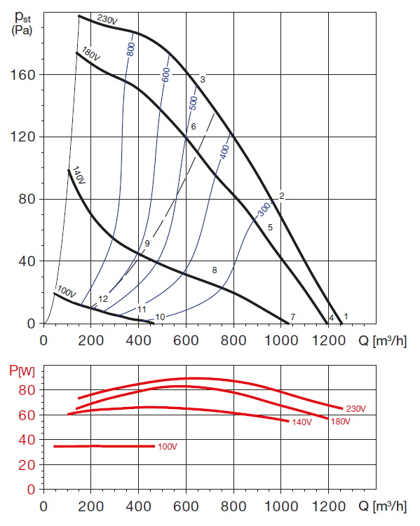 | otáčky [min-1] | příkon [W] | proud [A] | průtok (0 Pa) [m3/h] | napětí [V] | teplota [°C] | akust. tlak - sání [dB(A)] | akust. tlak - výtlak [dB(A)] | hmot. [kg] | velikost přísl. | regulátor |