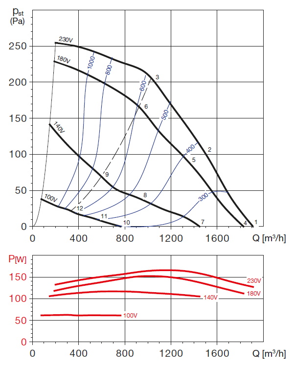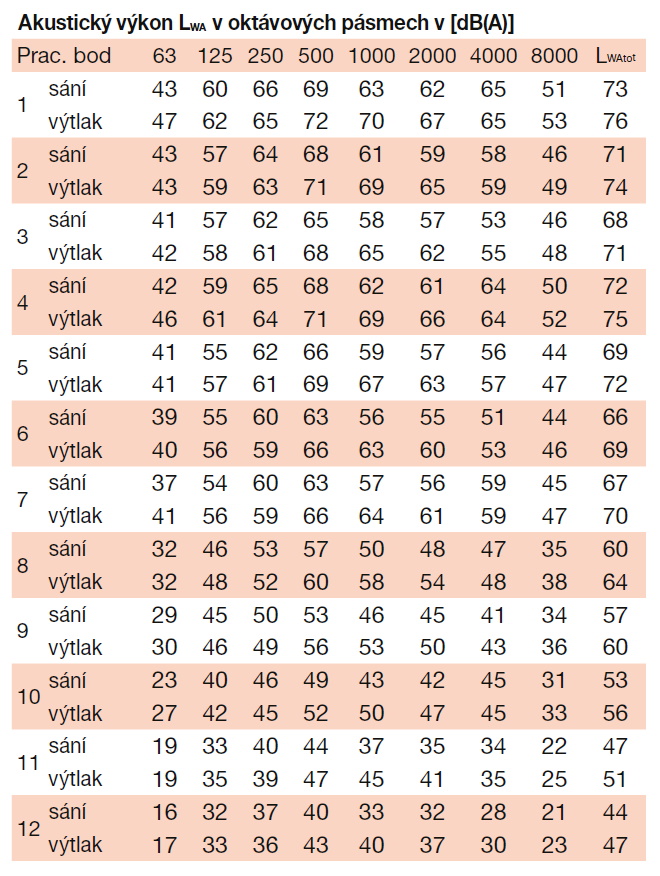 | otáčky [min-1] | příkon [W] | proud [A] | průtok (0 Pa) [m3/h] | napětí [V] | teplota [°C] | akust. tlak - sání [dB(A)] | akust. tlak - výtlak [dB(A)] | hmot. [kg] | velikost přísl. | regulátor |