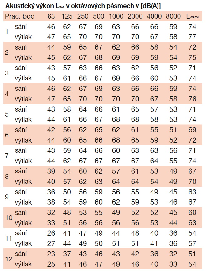 ![]() | Hluk Hluk emitovaný ventilátorem je uveden v tabulkách. Hodnoty LpA na výkonových charakteristikách jsou měřeny ve volném poli na straně sání ve vzdálenosti 1,5 m. | |