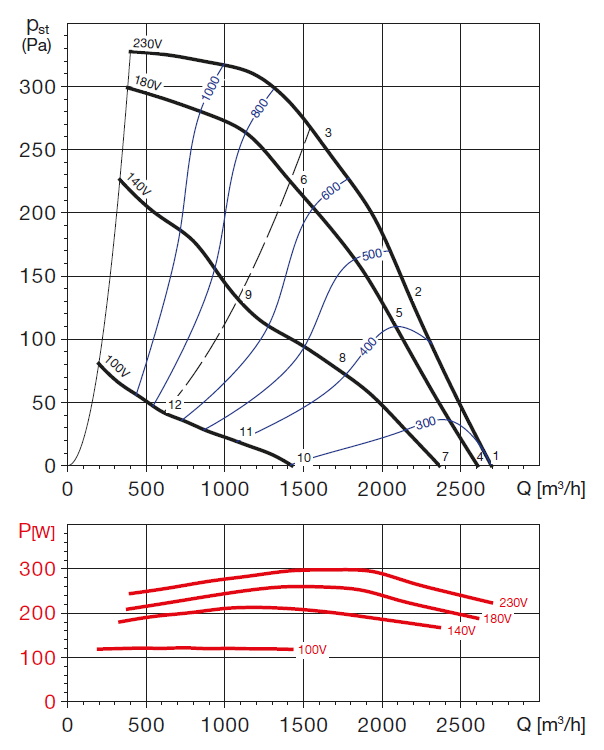| otáčky [min-1] | příkon [W] | proud [A] | průtok (0 Pa) [m3/h] | napětí [V] | teplota [°C] | akust. tlak - sání [dB(A)] | akust. tlak - výtlak [dB(A)] | hmot. [kg] | velikost přísl. | regulátor |