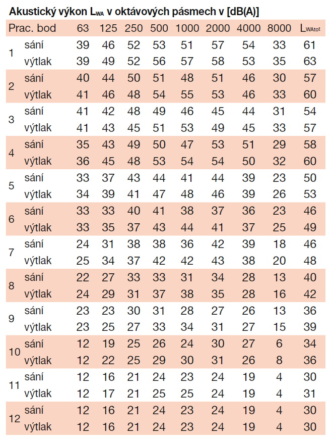 ![]() | Hluk Hluk emitovaný ventilátorem je uveden v tabulkách. Hodnoty LpA na výkonových charakteristikách jsou měřeny ve volném poli na straně sání ve vzdálenosti 1,5 m. | |