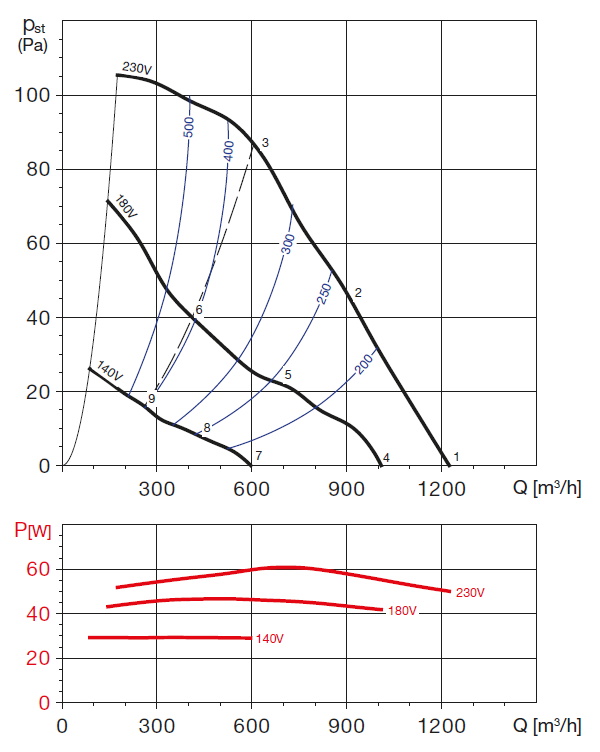 | otáčky [min-1] | příkon [W] | proud [A] | průtok (0 Pa) [m3/h] | napětí [V] | teplota [°C] | akust. tlak - sání [dB(A)] | akust. tlak - výtlak [dB(A)] | hmot. [kg] | velikost přísl. | regulátor |