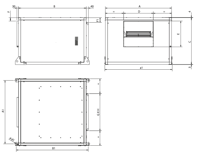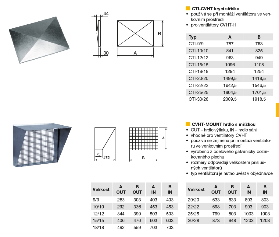![]() | Skříň Skříň je z ocelového, galvanicky pozinkovaného plechu sendvičového provedení s hliníkovými rohovníky. Ve spodní části jsou montážní patky pro uchycení ventilátoru k podlaze nebo stropu. Provedení s horizontálním výtlakem CVHT-H nebo vertikálním výtlakem CVHT-V. Motor s řemenovým převodem je uložen uvnitř skříně a standardně je na pravém boku skříně při pohledu ze strany výtlaku, alternativně lze dodat motor nalevo (CVHT/H-TI nebo CVHT/V-TI). | |