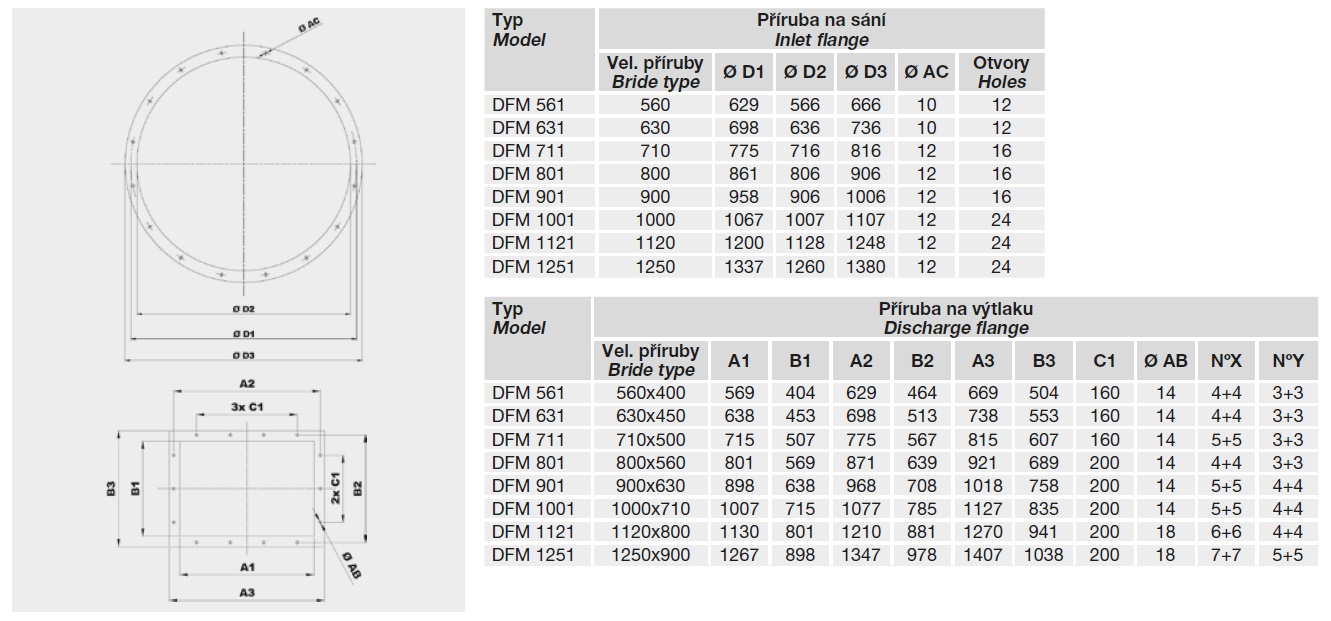 ![]() | Informace Oboustranně sací radiální ventilátor s motorem na řemen nebo na spojku. Vyroben z ocelového plechu chráněného kataforezním základním nátěrem a polyuretanovým lakem. Navržen pro trvalý provoz, teplota přepravované vzdušiny od -20 °C do +40 °C (do +60 °C v případě použití ložisek C3). Montážní sestavy: • PROVEDENÍ 6: Oběžné kolo uchyceno hřídelí uloženou v ložiscích na obou stranách spirální skříně. • PROVEDENÍ 17: Na spojku, stejné jako provedení 6, ale s podstavcem pro motor. • PROVEDENÍ 18: Stejné jako provedení 6, ale ventilátor a motor na společném rámu. • PROVEDENÍ 19: Stejné jako provedení 6, ale s motorem podporovaným konstrukcí skříně. Motory: 2, 4 nebo 6pólové, IE 3* s vysokou účinností, třífázové provedení 230/400 V, 50 Hz do velikosti motoru 132. Pro velikosti motoru nad 132 400/690 V, 50 Hz. Krytí IP55, izolace třídy F. * Od 0,75 kW může být motor IE 2 a řízen frekvenčním měničem. Na vyžádání: • nerez a další materiály • dvourychlostní motory • 60 Hz provedení • lakované v různých barvách RAL • revizní dvířka, odvod kondenzátu, ucpávka hřídele • tepelně izolovaná spirální skříň ATEX provedení: Na vyžádání možnost dodání v nevýbušném provedení podle směrnice ATEX pro třífázové motory a pro okolní atmosférické podmínky definované normou EN 14986. Rozsah teplot -20 °C až +60 °C, absolutní tlak 0,8 až 1,1 bar. • Plyn: 3G IIB T2-T3, motor ExnA (pouze pro zónu 3G) 3G IIB+H2 T2-T3, motor ExnA (pouze pro zónu 3G) | |
