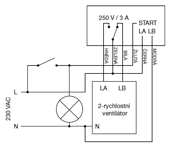 ![]() | Informace • určen pro přepínání otáček u dvourychlostních axiálních nebo radiálních ventilátorů • ventilátor provětrává trvale na nízké otáčky, po sepnutí vypínače nebo světelného zdroje přepínací relé přepne ventilátor na stanovenou dobu do vyšších otáček pro nárazové větrání • nastavitelná doba přepnutí 2–20 minut • jmenovité napětí 230 V/50 Hz • max. proud 3 A • krytí IP20 • je vestavěn v plastovém pouzdru, kterélze umístit pod vypínač nebo dvěma vruty na stěnu • LED dioda indikuje sepnutý stav | |