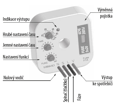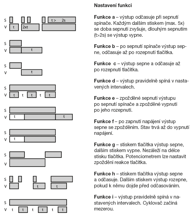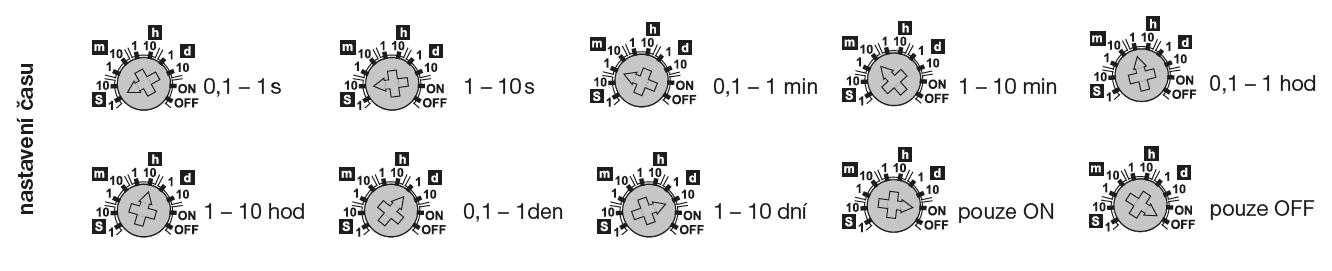 ![]() | Informace • nastavitelný čas 0,1 s až 10 dní • jmenovité napětí 230 V/50–60 Hz • max. proud 0,4 A induktivní zátěž • příkon 3 VA • teplota okolí 0–50 ˚C • devět funkčních režimů • je vestavěn v plastovém pouzdru, které lze umístit pod vypínač • krytí IP40 • hmotnost 27 g Nastavení zpoždění rozběhu (doběhu), cyklického spínání ventilátorů v sociálních zařízeních. Lze použít ke zpoždění vypnutí ventilátoru při vychlazování elektrických ohřívačů, k blokování kontaktů snímačů tlaku (sledování provozu ventilátorů) při rozběhu a doběhu. | |