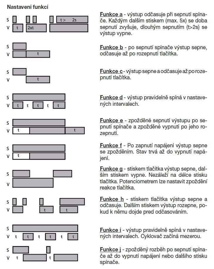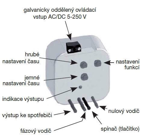 ![]() | Informace • nastavitelný čas 0,1 s až 10 hodin • jmenovité napětí 230 V/50-60 Hz • induktivní zátež 8 A 250 VAC (cos f > 0,4) • příkon 1 VA • teplota okolí 0–50 °C • deset funkčních režimů • je vestavěn v plastovém pouzdru, které lze umístit pod vypínač • krytí IP 30 • hmotnost 53 g Nastavení zpoždění rozběhu (doběhu), cyklického spínání ventilátorů v sociálních zařízeních. Lze použít ke zpoždění vypnutí ventilátoru při vychlazování elektrických ohřívačů, k blokování kontaktů snímačů tlaku (sledování provozu ventilátorů) při rozběhu a doběhu. Spínaný výstup může být zatížen i zářivkou. | |