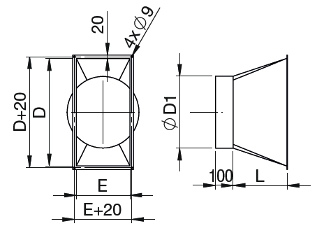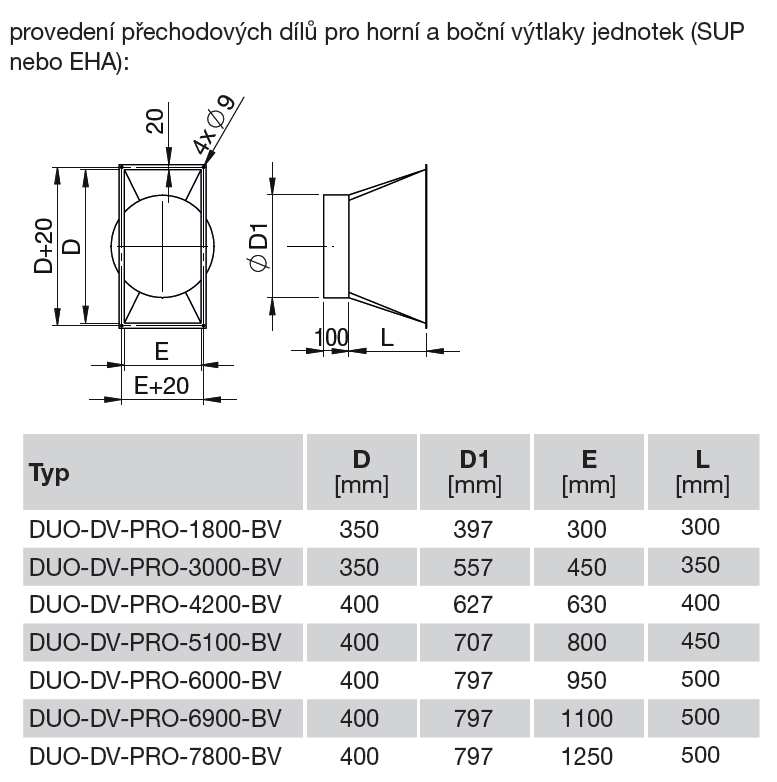 ![]() | Informace • přechodový díl na kruhové potrubí • na výtlaky jednotek velikostí DV 1800–7800 • šířka příruby 20 mm | |