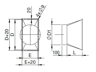 ![]() | Informace • přechodový díl na kruhové potrubí • na výtlaky jednotek velikostí RV 800–7800 • šířka příruby 20 mm | |