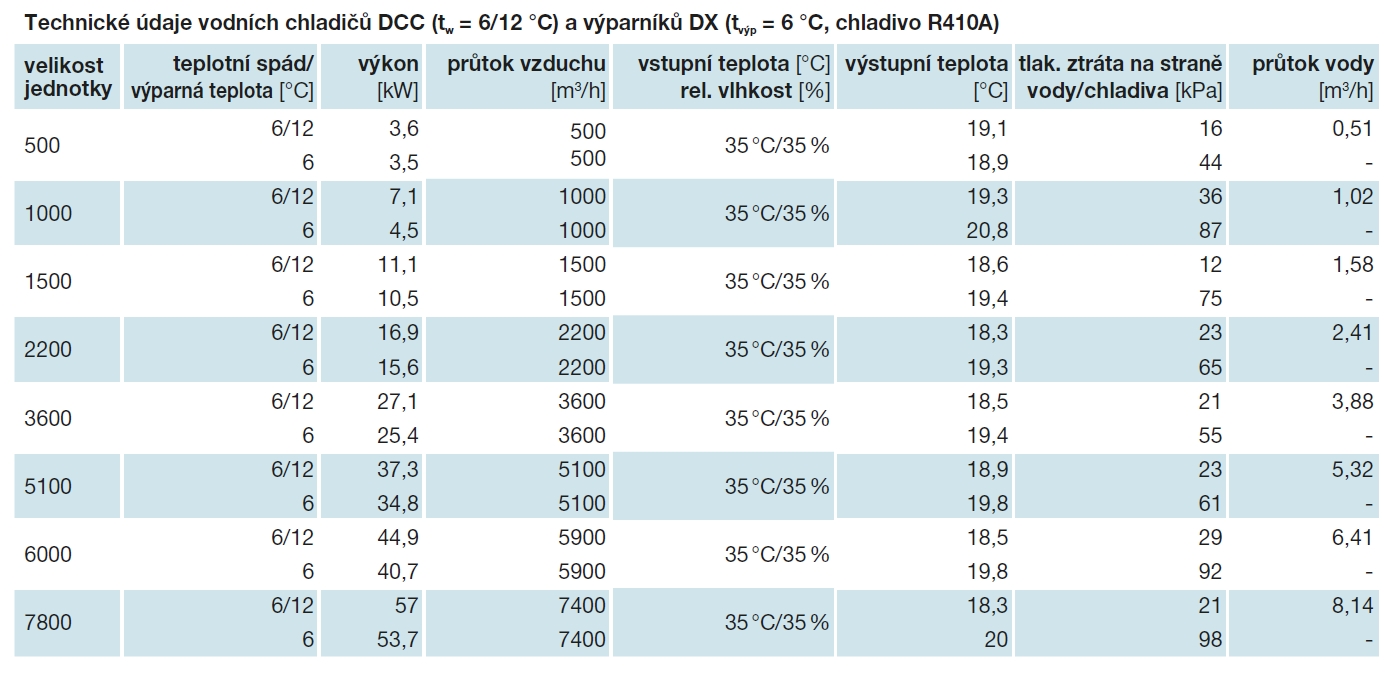 * při nominálním průtoku vzduchu, te = -12 °C/90 % r.v., ti = 22 °C/50 % r.v., te = 35 °C/35 % r.v. (LÉTO); ** v závislosti na konkrétním provedení. Výkon vodního chladiče DCC pro te = 35 °C/35 % r.v., tw = 6/12 °C. Výkon vodního ohřívače DCA pro te = 10 °C, tw = 80/60 °C. Výkon vodního ohřívače DCB pro te = 10 °C, tw = 45/35 °C. Výkon přímého výparníku DX pro chladivo R410A, te = 35 °C/35 % r.v., tvyp= 6 °C.