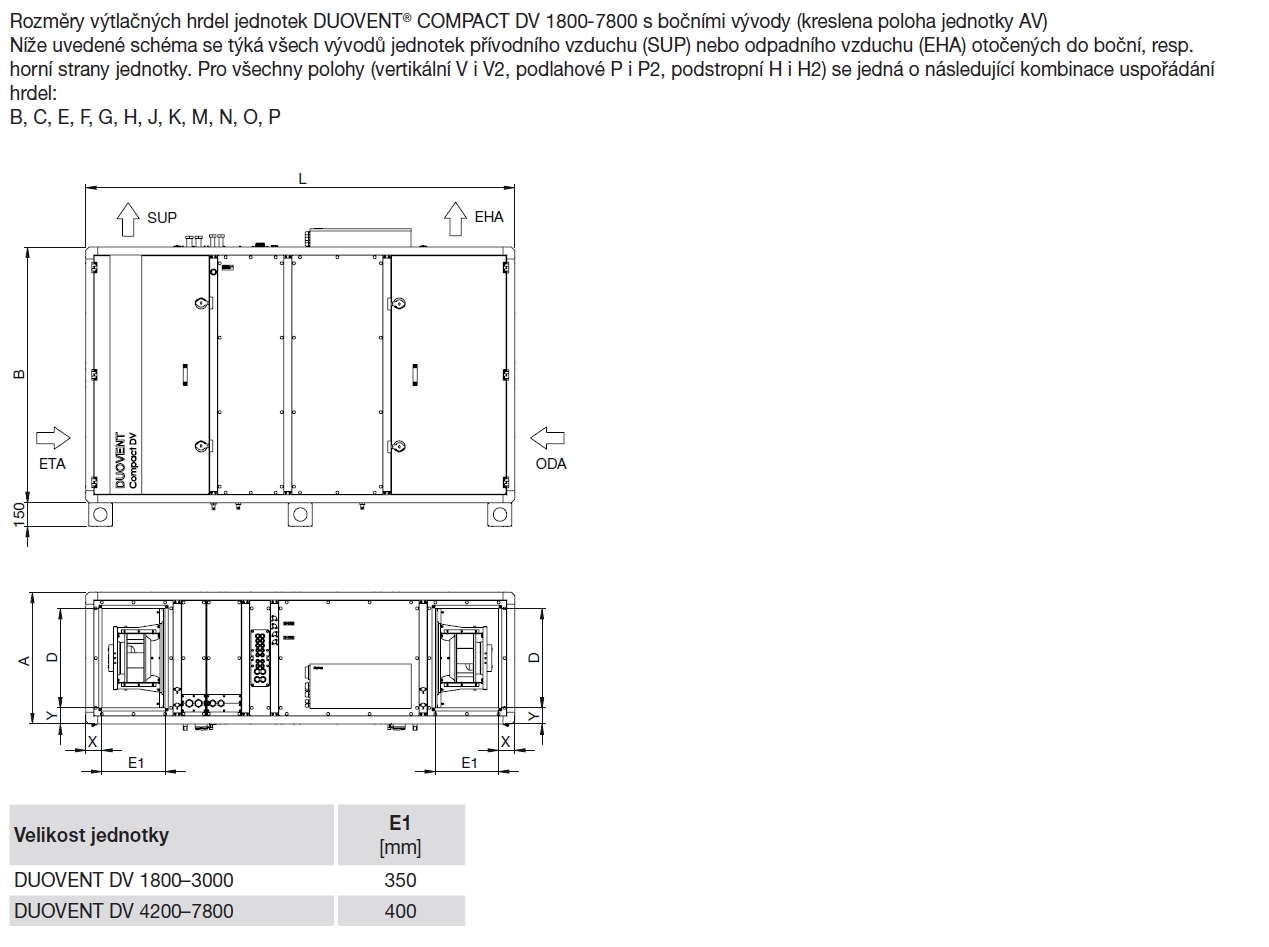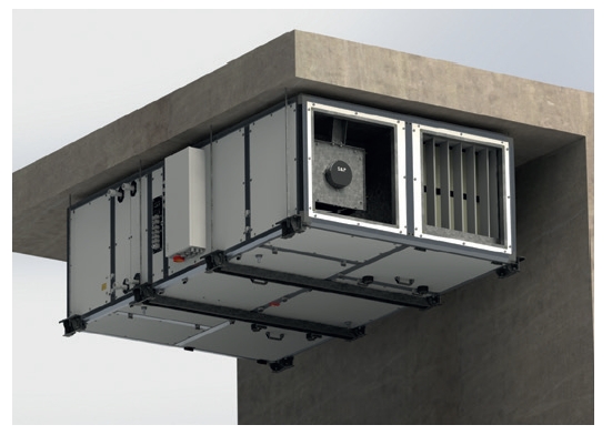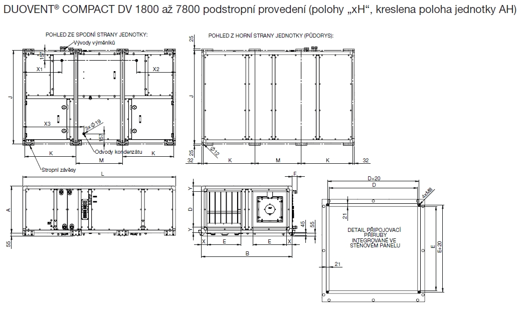 ![]() | Montáž Ve vertikální (označení poloh „xV“) nebo horizontální (označení poloh „xH“) poloze pod strop nebo na podlahu (označení poloh „xP“). Konkrétní rozmístění hrdel vzhledem k obslužné straně je nutné specifikovat. Před jednotkou je nutné zachovat předepsaný servisní prostor pro potřeby servisních zásahů, výměny filtrů apod. Pod jednotkou musí být prostor pro instalaci sifonu pro odvod kondenzátu. Jednotku je nutné montovat se spádem 5% směrem k odvodnímu hrdlu kondenzátu na straně chladiče vzduchu. Potrubí VZT se připojuje na připravená kruhová (DUOVENT® DV 500 až 1200) nebo v sendvičovém panelu integrovaná obdélníková hrdla (DUOVENT® DV 1800 až 7800). Doporučujeme mezi hrdla potrubí a jednotku montovat pružné manžety pro eliminaci přenosu vibrací z jednotky do potrubí. Obdélníková hrdla jsou integrována ve stěnovém sendvičovém panelu jednotky a rozteč rohových připojovacích otvorů je optimalizována pro připojovací příruby P20. Pro podstropní montáž na závitové tyče M10 je jednotka vybavena 4 ks podstropních závěsů (pro velikosti DUOVENT® DV 500 až 1200) nebo 8 ks podstropních závěsů (pro velikosti DUOVENT® DV 1800 až 7800). | |