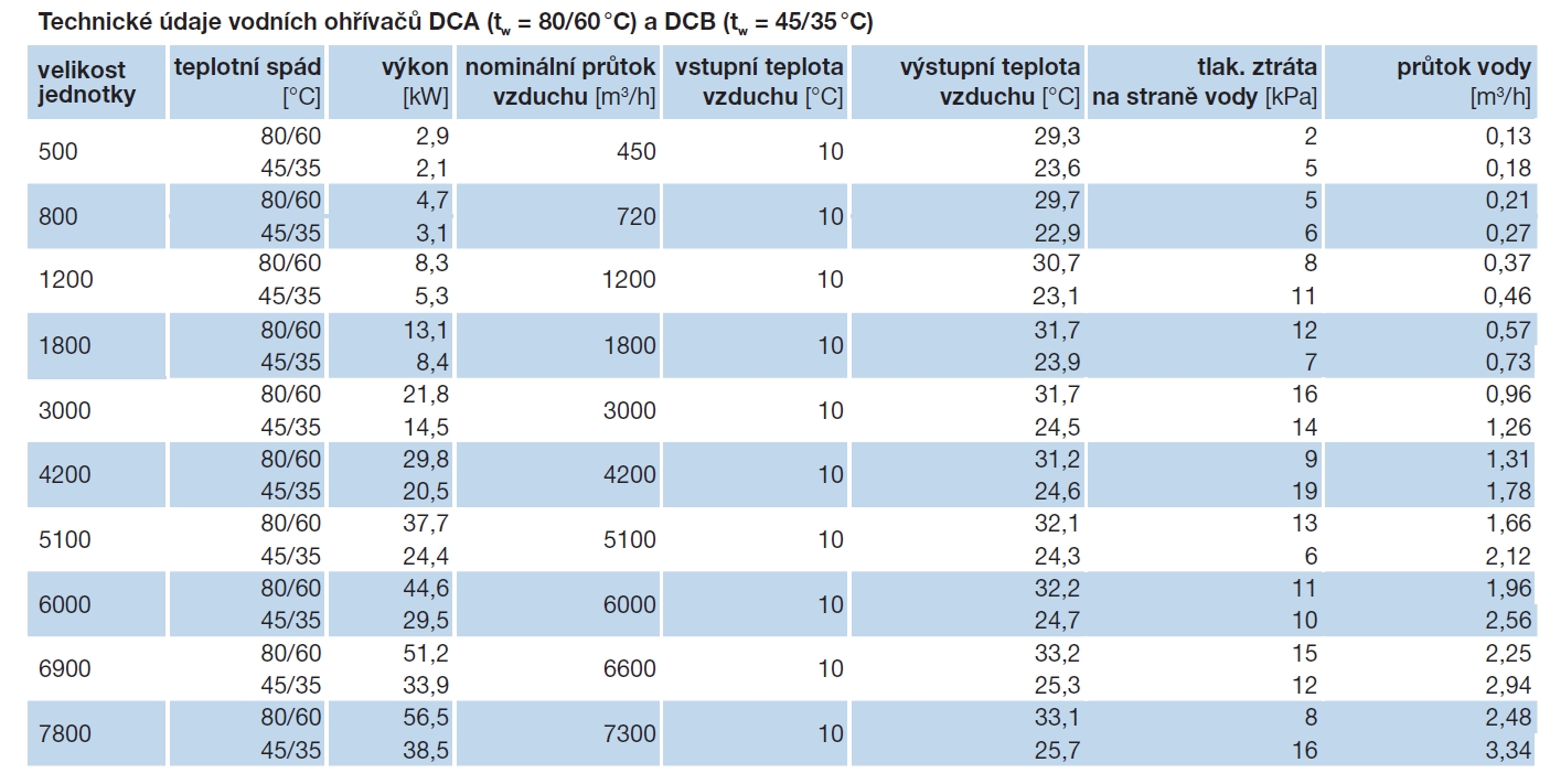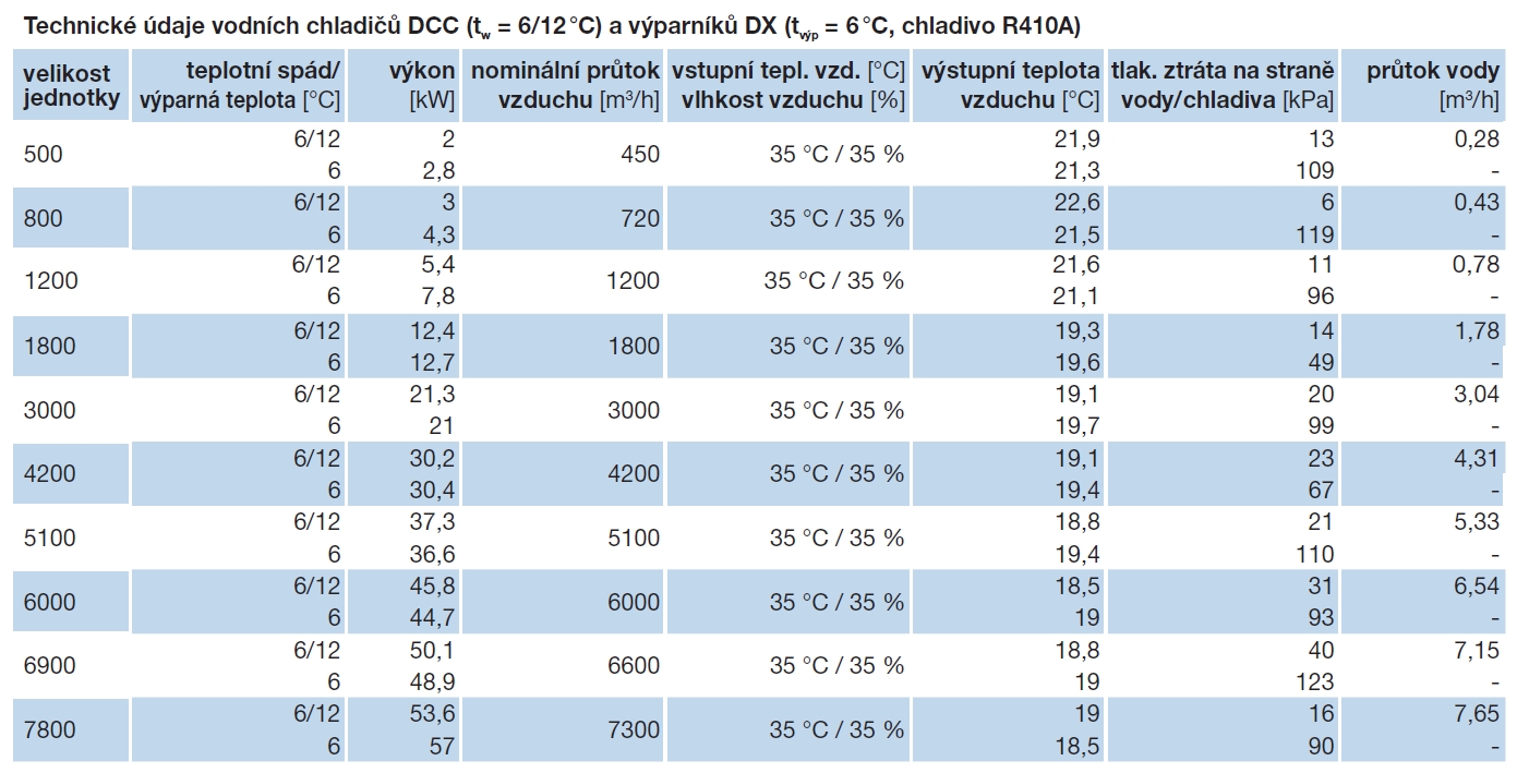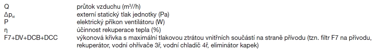 Výkon vodního chladiče DCC pro te = 35 °C/35 % r.v., tw = 6/12 °C. Výkon vodního ohřívače DCA pro te = 10 °C, tw = 80/60 °C. Výkon vodního ohřívače DCB pro te = 10 °C, tw = 45/35 °C. Výkon přímého výparníku DX pro chladivo R410A, te = 35 °C / 35 % r.v., tvyp= 6 °C. * - při nominálním průtoku vzduchu, te = -12 °C/90 % r.v., ti = 22 °C/50 % r.v., te = 35 °C/35 % r.v. (LÉTO). ** - pro uspořádání - PŘÍVOD: filtr F7+DV+DCB / ODVOD: filtr M5+DV. *** - v závislosti na výbavě jednotky (bez MaR)