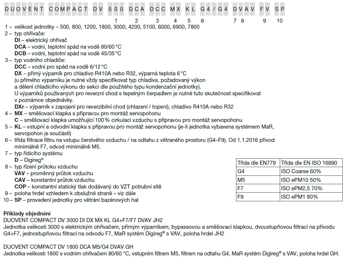 Údaje pro konfiguraci jednotky (integr. klapky, chladič vodní typ DCC, ohřívač vodní typ DCA, filtrační třída F7/M5). * útlum pláště s hodnotou De dle EN1886.