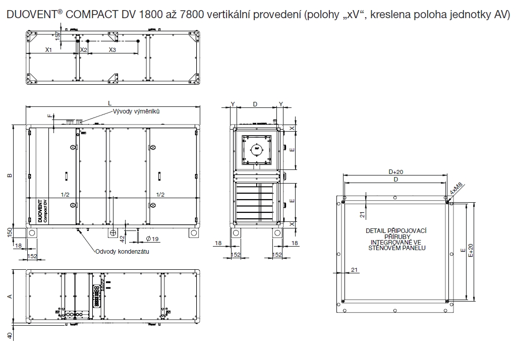 ![]() | Montáž Ve vertikální (označení poloh „xV“) nebo horizontální (označení poloh „xH“) poloze pod strop nebo na podlahu (označení poloh „xP“). Konkrétní rozmístění hrdel vzhledem k obslužné straně je nutné specifikovat. Před jednotkou je nutné zachovat předepsaný servisní prostor pro potřeby servisních zásahů, výměny filtrů apod. Pod jednotkou musí být prostor pro instalaci sifonu pro odvod kondenzátu. Jednotku je nutné montovat se spádem 5% směrem k odvodnímu hrdlu kondenzátu na straně chladiče vzduchu. Potrubí VZT se připojuje na připravená kruhová (DUOVENT® DV 500 až 1200) nebo v sendvičovém panelu integrovaná obdélníková hrdla (DUOVENT® DV 1800 až 7800). Doporučujeme mezi hrdla potrubí a jednotku montovat pružné manžety pro eliminaci přenosu vibrací z jednotky do potrubí. Obdélníková hrdla jsou integrována ve stěnovém sendvičovém panelu jednotky a rozteč rohových připojovacích otvorů je optimalizována pro připojovací příruby P20. Pro podstropní montáž na závitové tyče M10 je jednotka vybavena 4 ks podstropních závěsů (pro velikosti DUOVENT® DV 500 až 1200) nebo 8 ks podstropních závěsů (pro velikosti DUOVENT® DV 1800 až 7800). | |