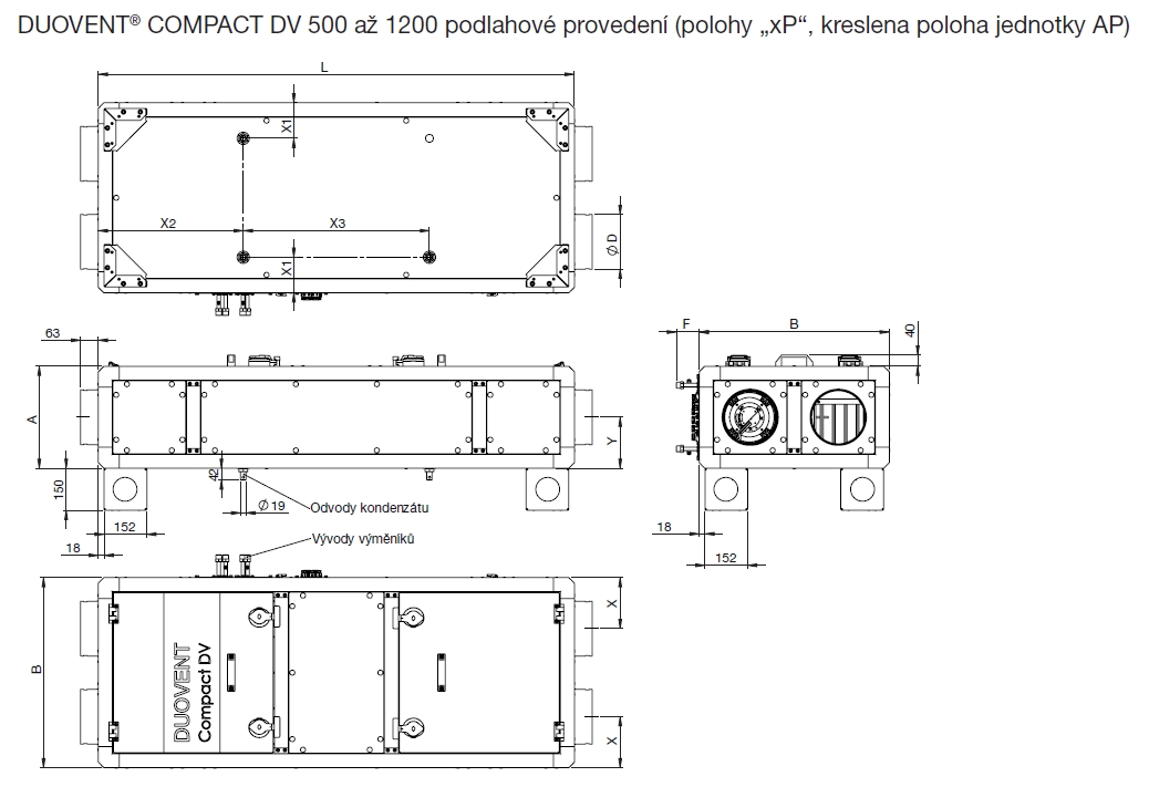 ![]() | Montáž Ve vertikální (označení poloh „xV“) nebo horizontální (označení poloh „xH“) poloze pod strop nebo na podlahu (označení poloh „xP“). Konkrétní rozmístění hrdel vzhledem k obslužné straně je nutné specifikovat. Před jednotkou je nutné zachovat předepsaný servisní prostor pro potřeby servisních zásahů, výměny filtrů apod. Pod jednotkou musí být prostor pro instalaci sifonu pro odvod kondenzátu. Jednotku je nutné montovat se spádem 5% směrem k odvodnímu hrdlu kondenzátu na straně chladiče vzduchu. Potrubí VZT se připojuje na připravená kruhová (DUOVENT® DV 500 až 1200) nebo v sendvičovém panelu integrovaná obdélníková hrdla (DUOVENT® DV 1800 až 7800). Doporučujeme mezi hrdla potrubí a jednotku montovat pružné manžety pro eliminaci přenosu vibrací z jednotky do potrubí. Obdélníková hrdla jsou integrována ve stěnovém sendvičovém panelu jednotky a rozteč rohových připojovacích otvorů je optimalizována pro připojovací příruby P20. Pro podstropní montáž na závitové tyče M10 je jednotka vybavena 4 ks podstropních závěsů (pro velikosti DUOVENT® DV 500 až 1200) nebo 8 ks podstropních závěsů (pro velikosti DUOVENT® DV 1800 až 7800). | |