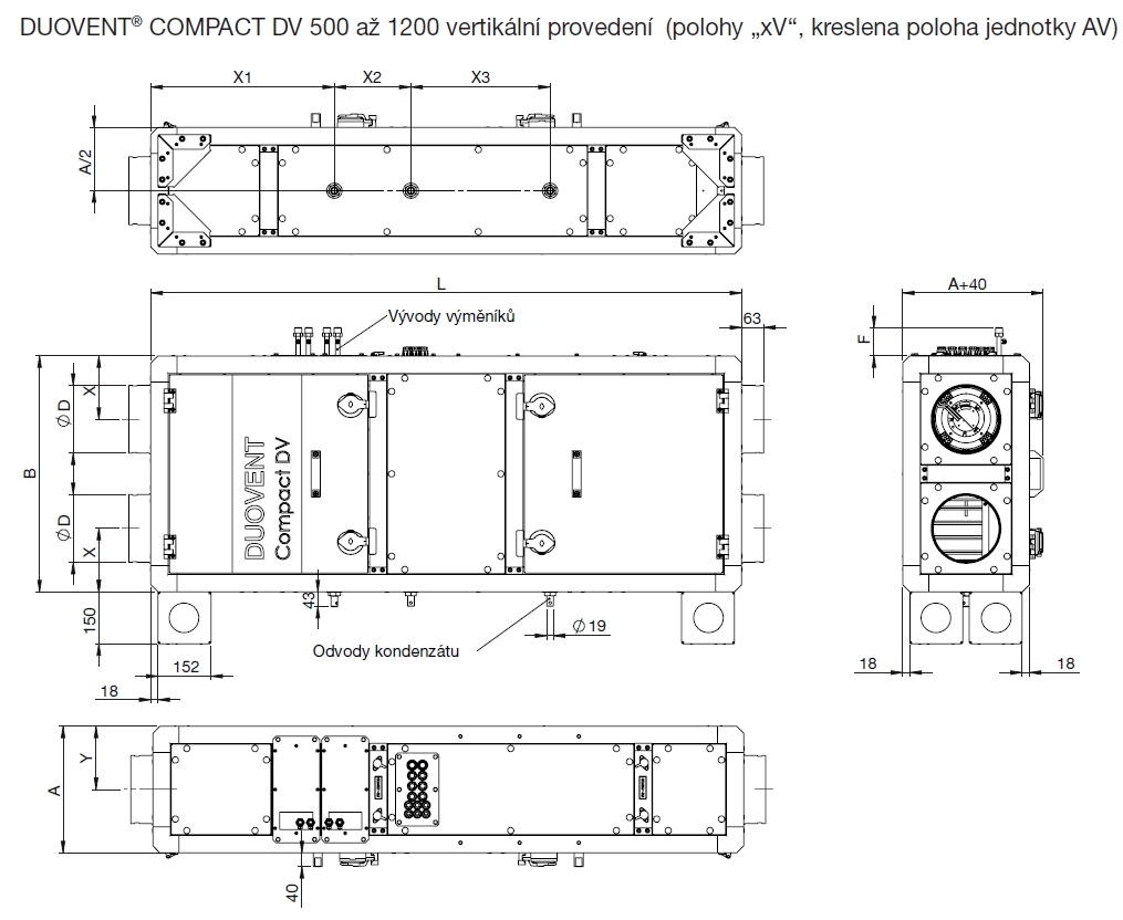 ![]() | Montáž Ve vertikální (označení poloh „xV“) nebo horizontální (označení poloh „xH“) poloze pod strop nebo na podlahu (označení poloh „xP“). Konkrétní rozmístění hrdel vzhledem k obslužné straně je nutné specifikovat. Před jednotkou je nutné zachovat předepsaný servisní prostor pro potřeby servisních zásahů, výměny filtrů apod. Pod jednotkou musí být prostor pro instalaci sifonu pro odvod kondenzátu. Jednotku je nutné montovat se spádem 5% směrem k odvodnímu hrdlu kondenzátu na straně chladiče vzduchu. Potrubí VZT se připojuje na připravená kruhová (DUOVENT® DV 500 až 1200) nebo v sendvičovém panelu integrovaná obdélníková hrdla (DUOVENT® DV 1800 až 7800). Doporučujeme mezi hrdla potrubí a jednotku montovat pružné manžety pro eliminaci přenosu vibrací z jednotky do potrubí. Obdélníková hrdla jsou integrována ve stěnovém sendvičovém panelu jednotky a rozteč rohových připojovacích otvorů je optimalizována pro připojovací příruby P20. Pro podstropní montáž na závitové tyče M10 je jednotka vybavena 4 ks podstropních závěsů (pro velikosti DUOVENT® DV 500 až 1200) nebo 8 ks podstropních závěsů (pro velikosti DUOVENT® DV 1800 až 7800). | |