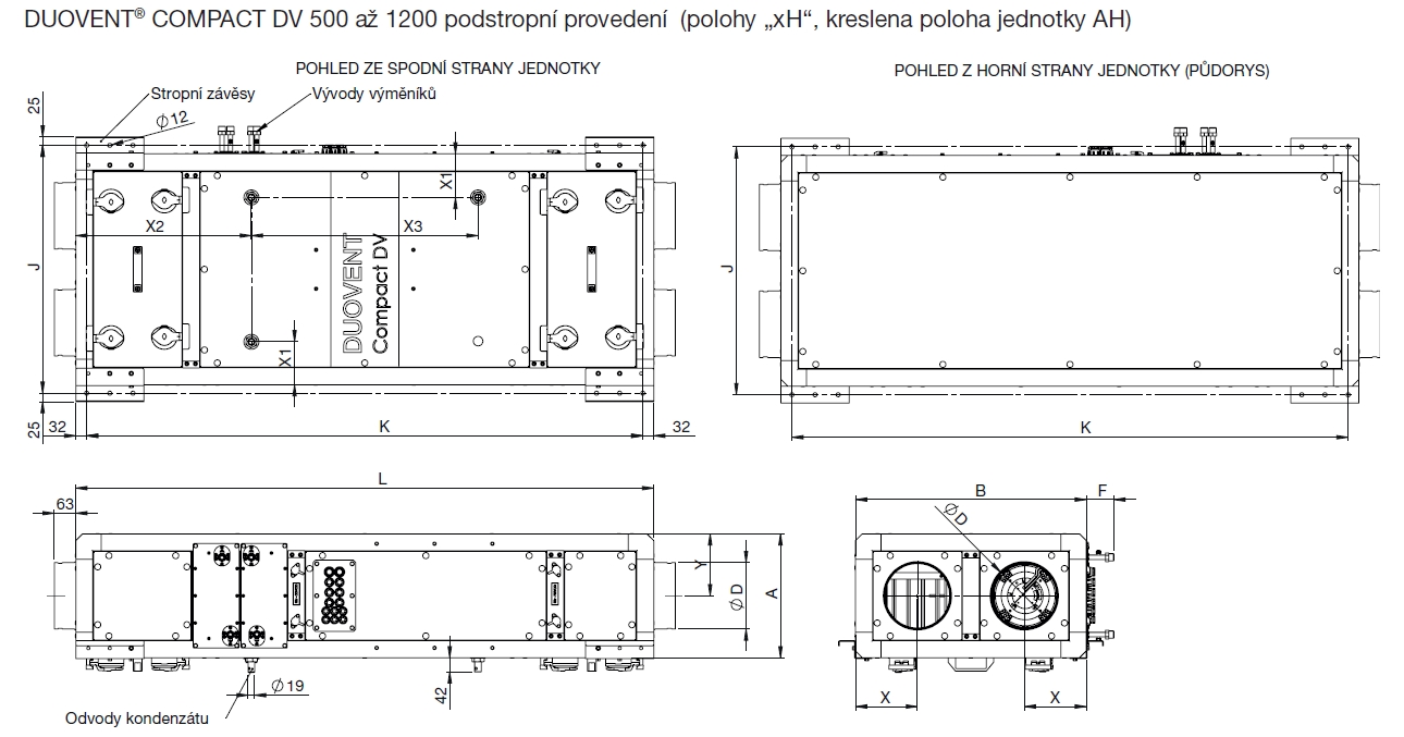 ![]() | Montáž Ve vertikální (označení poloh „xV“) nebo horizontální (označení poloh „xH“) poloze pod strop nebo na podlahu (označení poloh „xP“). Konkrétní rozmístění hrdel vzhledem k obslužné straně je nutné specifikovat. Před jednotkou je nutné zachovat předepsaný servisní prostor pro potřeby servisních zásahů, výměny filtrů apod. Pod jednotkou musí být prostor pro instalaci sifonu pro odvod kondenzátu. Jednotku je nutné montovat se spádem 5% směrem k odvodnímu hrdlu kondenzátu na straně chladiče vzduchu. Potrubí VZT se připojuje na připravená kruhová (DUOVENT® DV 500 až 1200) nebo v sendvičovém panelu integrovaná obdélníková hrdla (DUOVENT® DV 1800 až 7800). Doporučujeme mezi hrdla potrubí a jednotku montovat pružné manžety pro eliminaci přenosu vibrací z jednotky do potrubí. Obdélníková hrdla jsou integrována ve stěnovém sendvičovém panelu jednotky a rozteč rohových připojovacích otvorů je optimalizována pro připojovací příruby P20. Pro podstropní montáž na závitové tyče M10 je jednotka vybavena 4 ks podstropních závěsů (pro velikosti DUOVENT® DV 500 až 1200) nebo 8 ks podstropních závěsů (pro velikosti DUOVENT® DV 1800 až 7800). | |