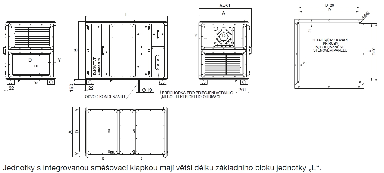 ![]() | El. připojení Napájecí napětí jednotek je 1×230 V/50 Hz nebo 3×400 V/50 Hz a je závislé na vybavení jednotky. Přívodní kabely, kabely k čidlům, silové kabely k ventilátorům se do jednotky přivádějí přes plastové průchodky ve stěně jednotky. Uvnitř jednotky jsou pro vedení kabelů připraveny gumové průchodky s membránou. | |