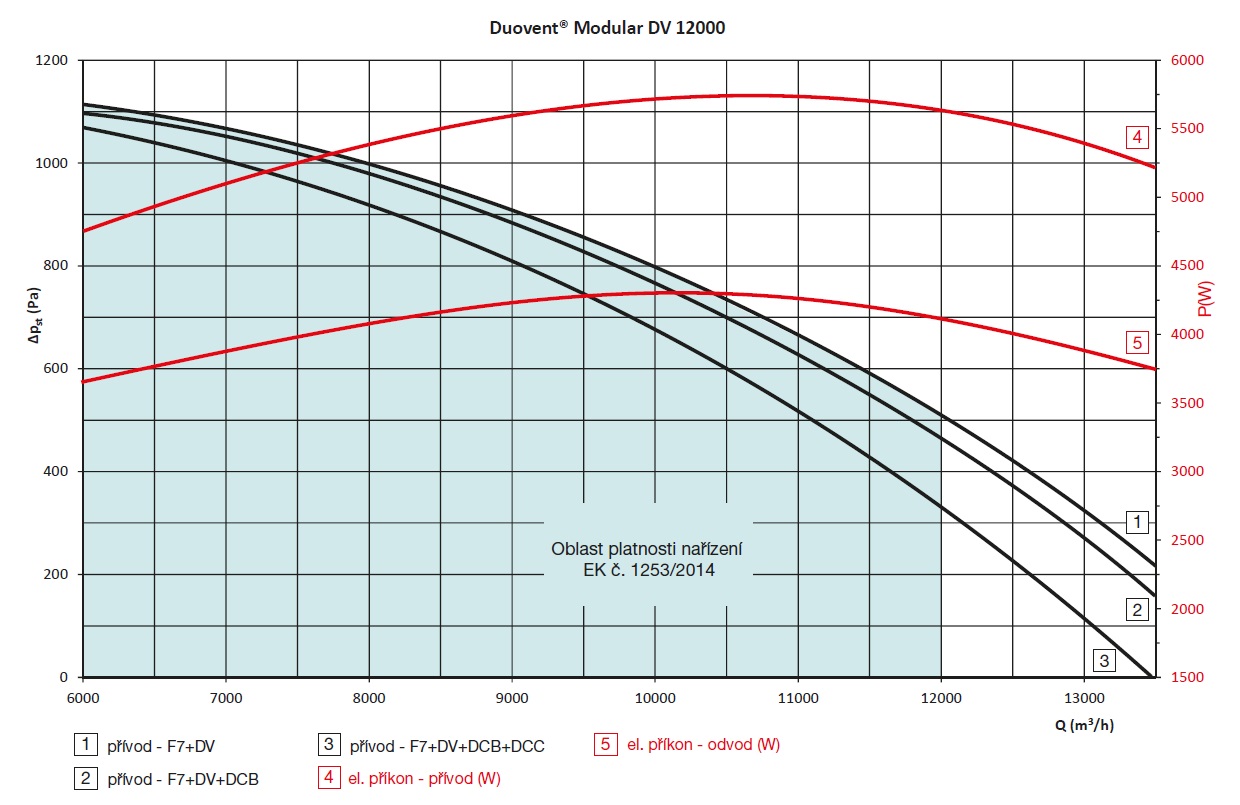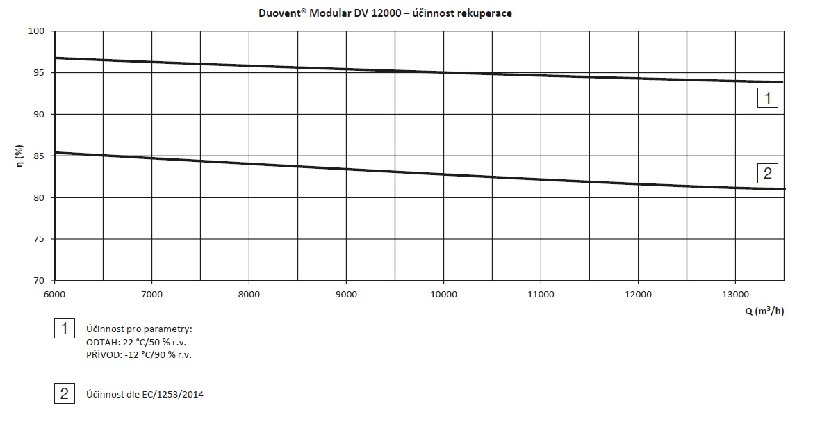 * při jmenovitém průtoku vzduchu, te = -12 °C / 90 % r.v., ti = 22 °C / 50 % r.v., te = 35 °C/35 % r.v. (LÉTO); ** pro uspořádání – přívod: filtr F7+DV+DCB, odvod: filtr M5+DV; *** v závislosti na výbavě jednotky (bez MaR) Výkon vodního chladiče DCC pro te = 35 °C / 35 % r.v., tw = 6/12 °C. Výkon vodního ohřívače DCA pro te = 10 °C, tw = 80/60 °C. Výkon vodního ohřívače DCB pro te = 10 °C, tw = 45/35 °C. Výkon přímého výparníku DX pro chladivo R410A, te = 35 °C / 35 % r.v., tvyp= 6 °C.