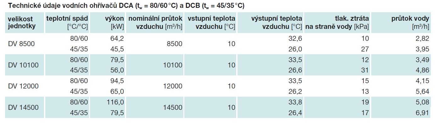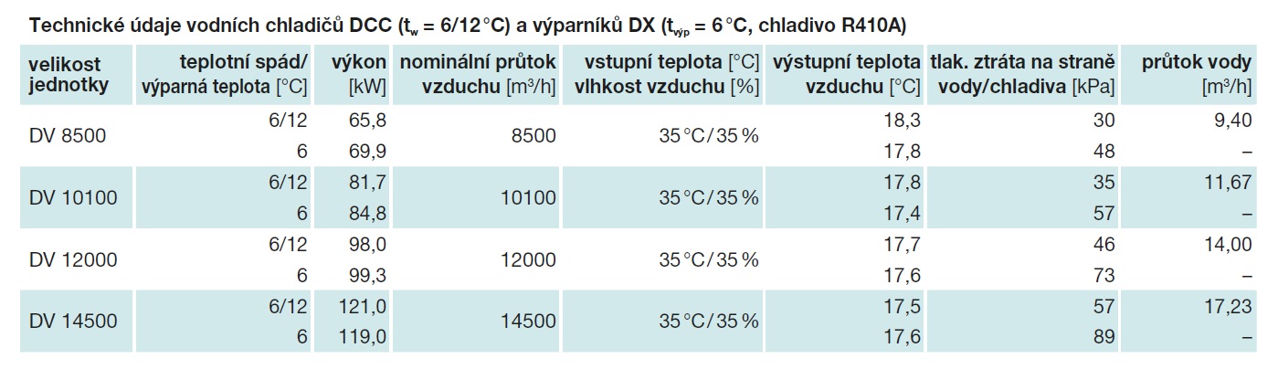 * při jmenovitém průtoku vzduchu, te = -12 °C / 90 % r.v., ti = 22 °C / 50 % r.v., te = 35 °C/35 % r.v. (LÉTO); ** pro uspořádání – přívod: filtr F7+DV+DCB, odvod: filtr M5+DV; *** v závislosti na výbavě jednotky (bez MaR) Výkon vodního chladiče DCC pro te = 35 °C / 35 % r.v., tw = 6/12 °C. Výkon vodního ohřívače DCA pro te = 10 °C, tw = 80/60 °C. Výkon vodního ohřívače DCB pro te = 10 °C, tw = 45/35 °C. Výkon přímého výparníku DX pro chladivo R410A, te = 35 °C / 35 % r.v., tvyp= 6 °C.