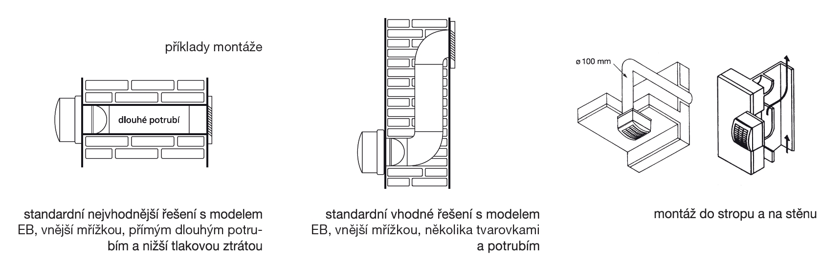 ![]() | Varianty • EB 100 N S standardní provedení • EB 100 N T doběh 5–25 min. • EB 100 N HT vestavěný hygrostat (60 - 90 %) s nastavitelným doběhem | |