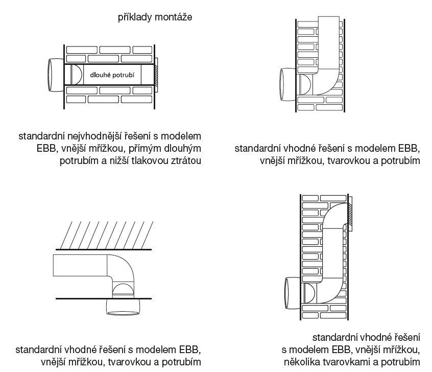 ![]() | Montáž Montáž se provádí na stěnu pomocí papírové montážní šablony, která je součástí dodávky. V dodávce jsou i hmoždinky a šrouby. Po sejmutí čelní mřížky dojde automaticky k vypnutí ventilátoru vestavěným bezpečnostním spínačem. Při montáži doporučujeme pružné podložky pod montážní body ventilátoru pro snížení přenosu hluku stavební konstrukcí. | |