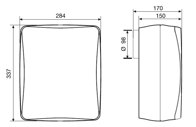 ![]() | Skříň Skříň je z nárazuvzdorného plastu, barva je bílá. Skříň je určená k montáži na stěnu nebo strop. Ve výtlaku ventilátoru je zpětná klapka. Čelní panel obsahuje nerezovou filtrační mřížku. | |