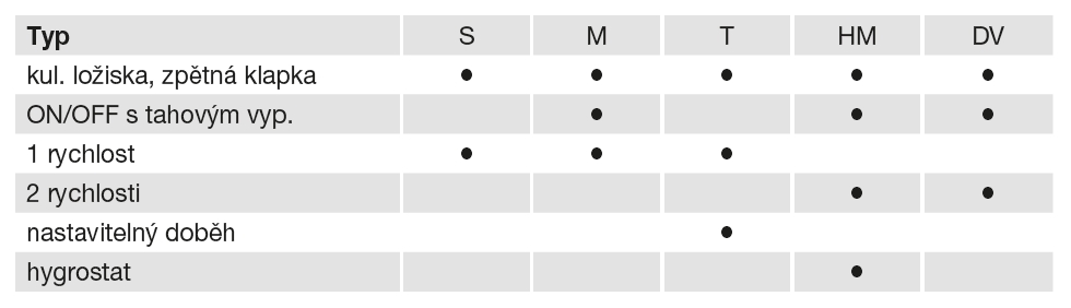 ![]() | Varianty • S - základní jednootáčkové provedení • T - doběh 1–30 minut • M – ovládání tahovým vypínačem • HM – dvourychlostní s hygrostatem a s tahovým vypínačem • DV – dvourychlostní, s tahovým vypínačem | |