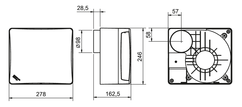 ![]() | Montáž Montáž se provádí na stěnu pomocí papírové montážní šablony, která je součástí dodávky. V dodávce jsou i hmoždinky a šrouby. Po sejmutí čelní mřížky dojde automaticky k vypnutí ventilátoru vestavěným bezpečnostním spínačem. Při montáži doporučujeme pružné podložky pod montážní body ventilátoru pro snížení přenosu hluku stavební konstrukcí. | |