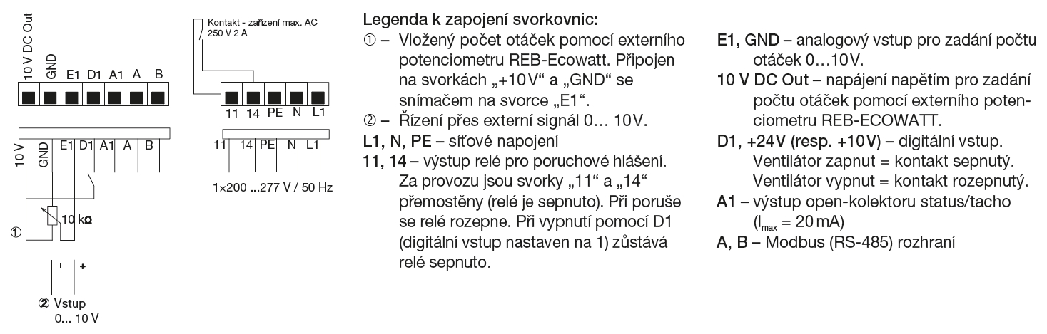 ![]() | Motor Elektronicky komutovaný motor s plynulým řízením otáček pomocí signálu 0…10 V s vestavěnou elektronikou (alternativně je možné řídit otáčky elektromotoru pomocí PWM signálu). Krytí motoru IP54, pracovní teplota v rozsahu –25 °C až +60 °C. Třída účinnosti motoru IE4. Motor je opatřen vestavěnou tepelnou ochranou. Kuličková ložiska jsou oboustranně uzavřená s tukovou náplní na dobu životnosti. | |