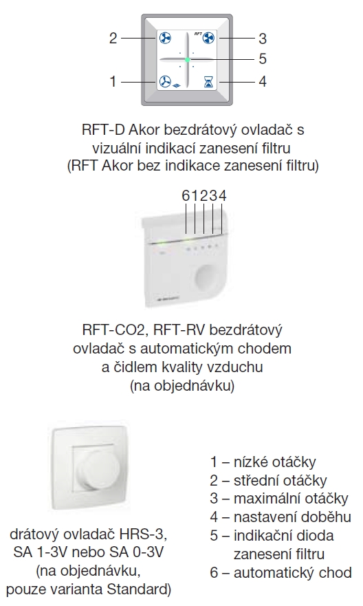 ![]() | Varianty • EHR 300 Akor Standard – provedení s pětižilovým kabelem, příslušenství: • grafický panel pro nastavení a indikaci provozu (součást dodávky) • SA 1-3 V, SA 0-3 V drátové přepínače otáček • RFT Akor bezdrátový ovladač • RFT-D Akor bezdrátový ovladač s vizuální indikací zanesení filtru • RFT-CO2 bezdrátový ovladač s integrovaným čidlem CO2 • RFT-RV bezdrátový ovladač s integrovaným čidlem relativní vhkosti • AIRSENS drátová čidla CO2/RH/VOC se spínacím relé • EHR 300 Akor RF – provedení s napájecím kabelem s vidlicí, příslušenství: • grafický panel pro nastavení a indikaci provozu (součást dodávky) • RFT Akor bezdrátový ovladač • RFT-D Akor bezdrátový ovladač s vizuální indikací zanesení filtru • RFT-CO2 bezdrátový ovladač s integrovaným čidlem CO2 • RFT-RV bezdrátový ovladač s integrovaným čidlem relativní vhkosti | |