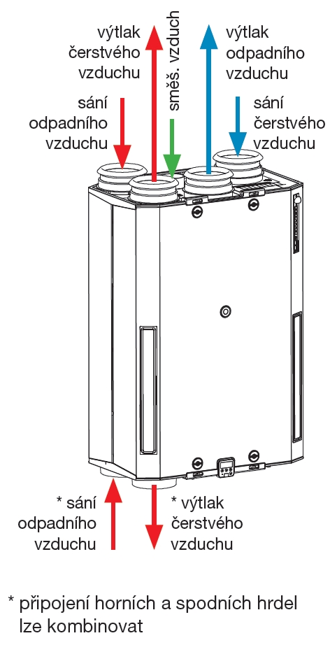 ![]() | Skříň Skříň je z odolného pěnového extrudovaného polystyrenu s vysokou hustotou. Vrchní část tvoří lakovaný ocelový plech opatřený práškovým lakem v bílém odstínu. Čtyři horní a dvě spodní kruhová hrdla jsou z tvrzeného plastu a jsou opatřené těsnicí gumou, která umožňuje montáž potrubí Ø 150 a Ø 160. Vedle hrdla odpadního vzduchu je otvor protimrazové klapky Ø 80. | |