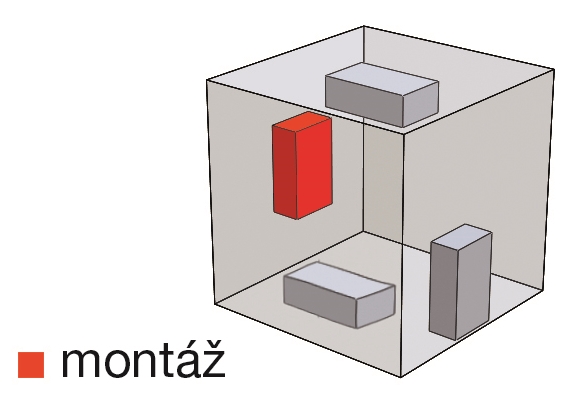 akustický výkon změřený pro 3 vybrané pracovní body výkonového pole - (1) 75 m3/h; 20 Pa (2) 80 m3/h; 80 Pa (3) 275 m3/h; 150 Pa