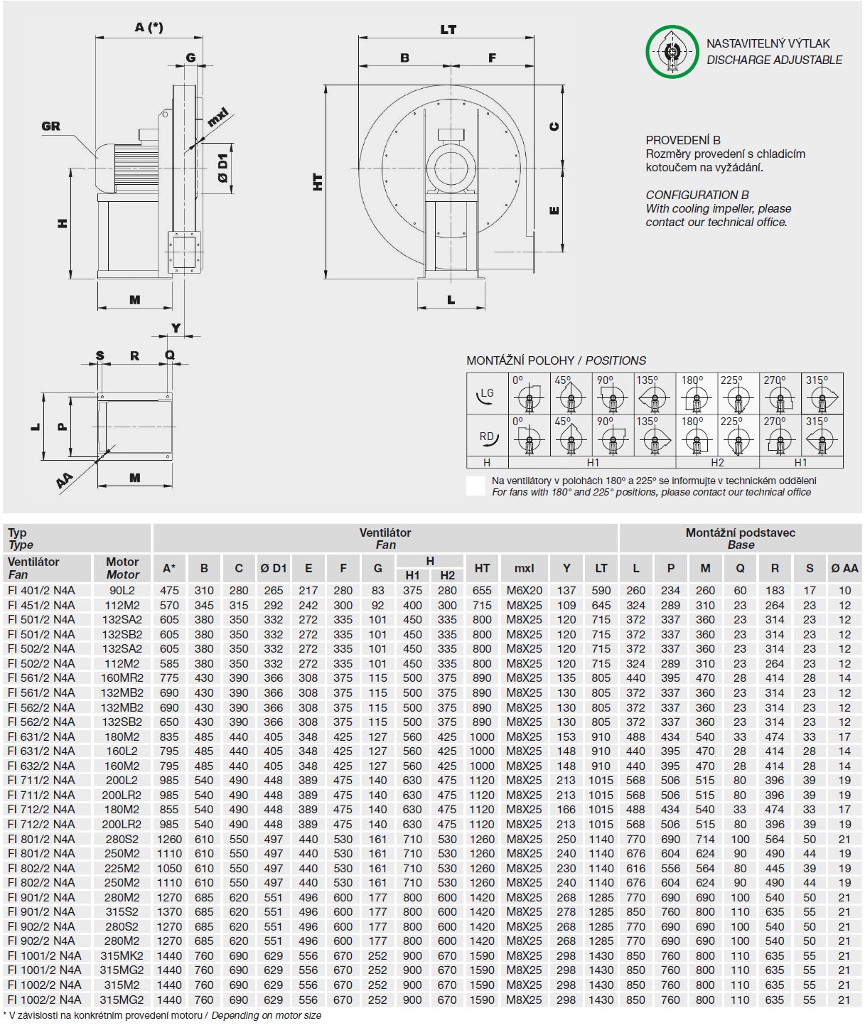 ![]() | Informace Jednostranně sací radiální ventilátor s motorem napřímo. Vyroben z ocelového plechu chráněného kataforezním základním nátěrem a polyuretanovým lakem. Navržen pro trvalý provoz, teplota přepravované vzdušiny od -20 °C do +60 °C. Motory: 2pólové, IE 3* s vysokou účinností, třífázové provedení 230/400 V, 50 Hz do velikosti motoru 132. Pro velikosti motoru nad 132 400/690 V, 50 Hz. Krytí IP55, izolace třídy F. * Od 0,75 kW může být motor IE 2 a řízen frekvenčním měničem. Na vyžádání: • nerez a další materiály • dvourychlostní motory • 60 Hz provedení • lakované v různých barvách RAL • ventilátor bez podstavce (provedení 5) do velikosti motoru 160 • vysokoteplotní provedení (až do 150 °C, provedení B s chladicím kotoučem) • ventilátor s pohonem na spojku (provedení 8) • revizní dvířka, odvod kondenzátu, ucpávka hřídele • svařovaná spirální skříň • tepelně izolovaná spirální skříň ATEX provedení: Na vyžádání možnost dodání v nevýbušném provedení podle směrnice ATEX pro třífázové motory a pro okolní atmosférické podmínky definované normou EN 14986. Rozsah teplot -20 °C až +60 °C, absolutní tlak 0,8 až 1,1 bar. • Plyn: 2G IIB T2-T3-T4, motor ExdIIB nebo ExeII 2G IIB+H2 T2-T3-T4, motor ExdIIC 3G IIB T2-T3-T4, motor ExnA (pouze pro zónu 3G) 3G IIB+H2 T2-T3-T4, motor ExnA (pouze pro zónu 3G) • Nevodivý prach: 2D IIIB T125°C-T135°C-T195°CT295°C 3D IIIB T125°C-T135°C-T195°CT295°C • Vodivý prach (povinný motor IP65): 2D IIIC T125°C-T135°C-T195°CT295°C 3D IIIC T125°C-T135°C-T195°CT295°C | |