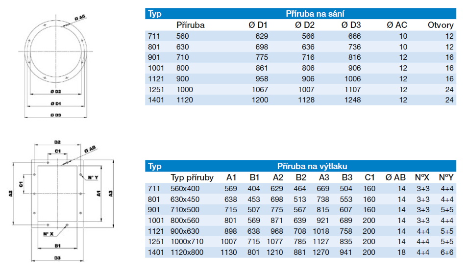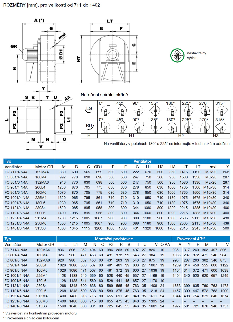 ![]() | Informace Jednostranně sací radiální ventilátor s motorem napřímo. Vyroben z ocelového plechu chráněného kataforezním základním nátěrem a polyuretanovým lakem. Navržen pro trvalý provoz, teplota přepravované vzdušiny od -20 °C do +60 °C. Motory: 2, 4 nebo 6pólové, IE 3* s vysokou účinností, třífázové provedení 230/400 V, 50 Hz do velikosti motoru 132. Pro velikosti motoru nad 132 400/690 V, 50 Hz. Krytí IP55, izolace třídy F. Všechny motory lze regulovat FM. Na vyžádání: • nerez AISI304, AISI316, CORTEN, CREUSABRO 4800 a další materiály • 60 Hz provedení • lakované v různých barvách RAL • ventilátor bez podstavce (provedení 5) do velikosti motoru 160 • vysokoteplotní provedení (až do 220 °C, provedení B s chladicím kotoučem), do 300 °C provedení 8 nebo 12 • ventilátor s pohonem na spojku (provedení 8) nebo na řemen (provedení 12) • revizní dvířka, odvod kondenzátu, ucpávka hřídele, antivibrační sada, nátrubek pro odvod kondenzátu, ochranná mřížka na sání, plynotěsné provedení, provedení s vyšší otěruvzdorností, svařovaná spirální skříň, tepelně izolovaná spirální skříň ATEX provedení: Na vyžádání možnost dodání v nevýbušném provedení podle směrnice ATEX pro třífázové motory a pro okolní atmosférické podmínky definované normou EN 14986. Rozsah teplot -20 °C až +60 °C, absolutní tlak 0,8 až 1,1 bar. • Plyn: 2G IIB T2-T3-T4, motor ExdIIB nebo ExeII 2G IIB+H2 T2-T3-T4, motor ExdIIC 3G IIB T2-T3-T4, motor ExnA (pouze pro zónu 3G) 3G IIB+H2 T2-T3-T4, motor ExnA (pouze pro zónu 3G) • Nevodivý prach: 2D IIIB T125°C-T135°C-T195°CT295°C 3D IIIB T125°C-T135°C-T195°CT295°C • Vodivý prach (povinný motor IP65): 2D IIIC T125°C-T135°C-T195°CT295°C 3D IIIC T125°C-T135°C-T195°CT295°C | |