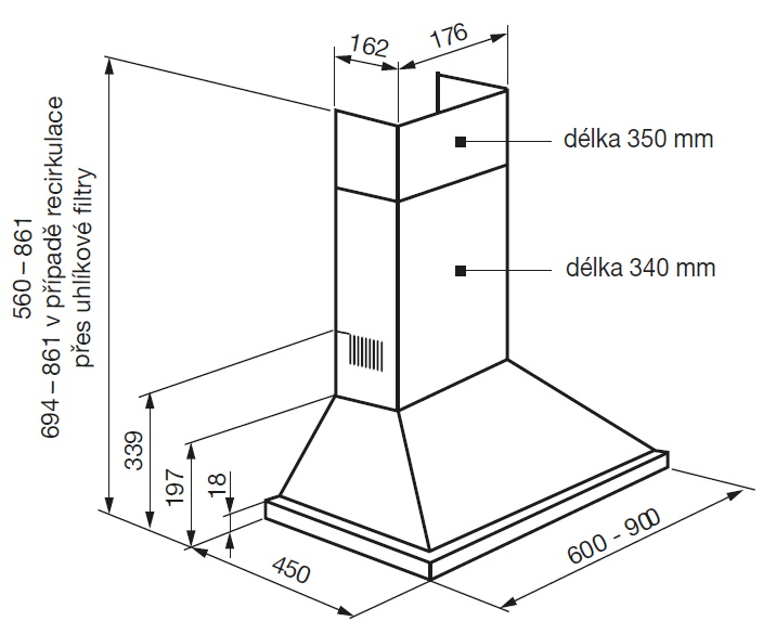 ![]() | Informace • volba tří rychlostí ventilátoru • osvětlení: LED 2× 3 W • profesionální hliníkový tukový filtr • zpětná klapka na výtlaku • horní vývod pro napojení • recirkulace vzduchu přes uhlíkové filtry (příslušenství) • provedení: nerez • teleskopický komín • redukce pro výtlačné potrubí DN 150/120 • dostupné velikosti (šířka v mm): 600 a 900 | |