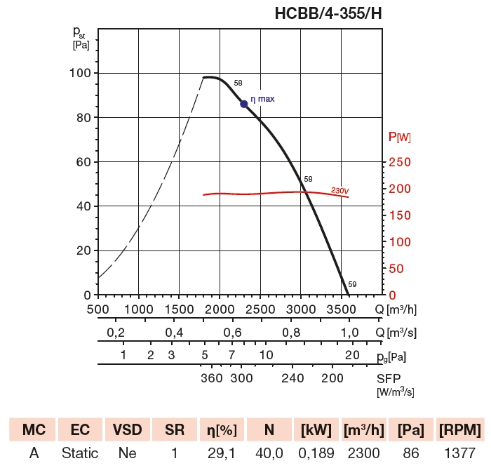 | otáčky [min-1] | průtok (0 Pa) [m3/h] | příkon [W] | napětí [V] | proud [A] | max. teplota [°C] | akust. tlak [dB(A)] | hmotnost [kg] | regulátor |