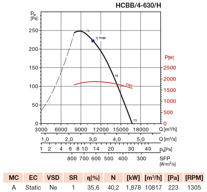 | otáčky [min-1] | průtok (0 Pa) [m3/h] | příkon [W] | napětí [V] | proud [A] | max. teplota [°C] | akust. tlak [dB(A)] | hmotnost [kg] | regulátor |