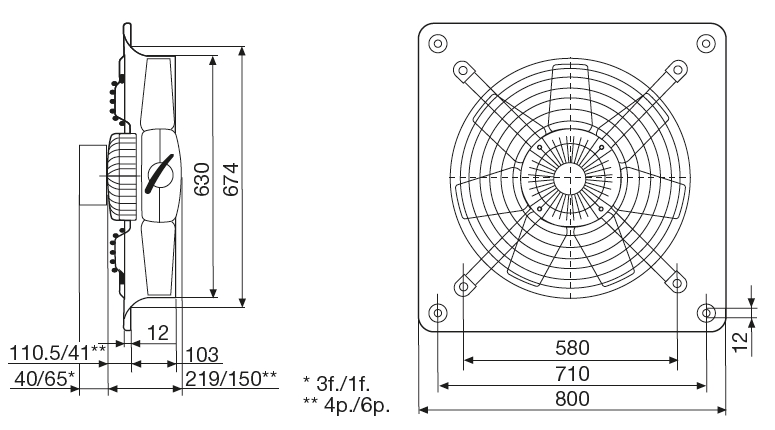 ![]() | Směr otáčení Směr otáčení je možno měnit. Se standardním oběžným kolem klesne při opačném směru otáčení průtok o cca 30%. Průtok vzdušiny je standardně od motoru k oběžnému kolu. | |