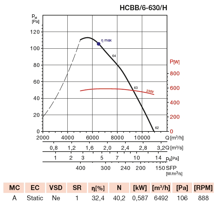 | otáčky [min-1] | průtok (0 Pa) [m3/h] | příkon [W] | napětí [V] | proud [A] | max. teplota [°C] | akust. tlak [dB(A)] | hmotnost [kg] | regulátor |