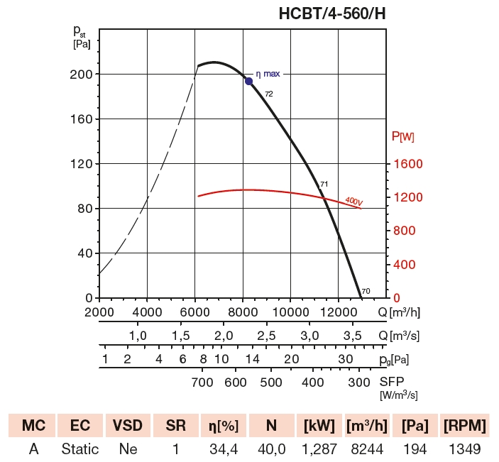 | otáčky [min-1] | průtok (0 Pa) [m3/h] | příkon [W] | napětí [V] | proud [A] | max. teplota [°C] | akust. tlak [dB(A)] | hmotnost [kg] | regulátor |